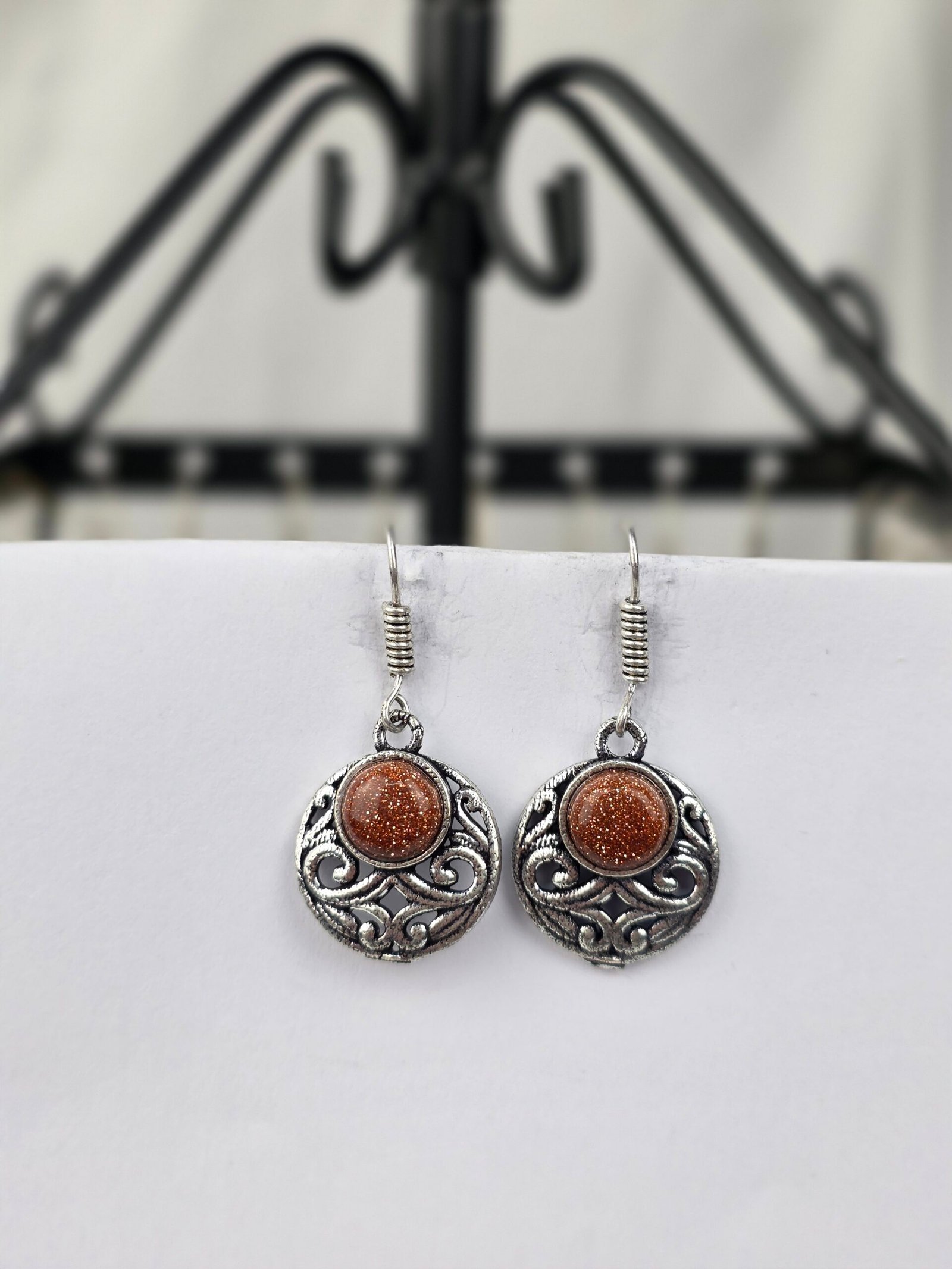 - Piedra Principal: Piedra Sol / Goldstone Marrón de corte cabujón redondo.