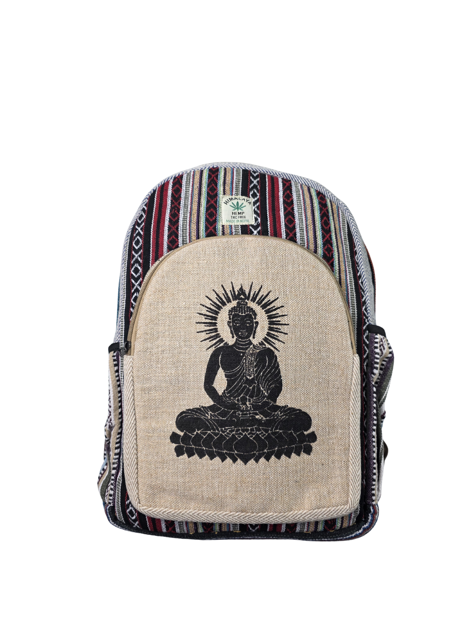 Descripción del Producto : Mochila de Cáñamo del Himalaya “Buda en Meditación” – Mochila Étnica Hecha a Mano
