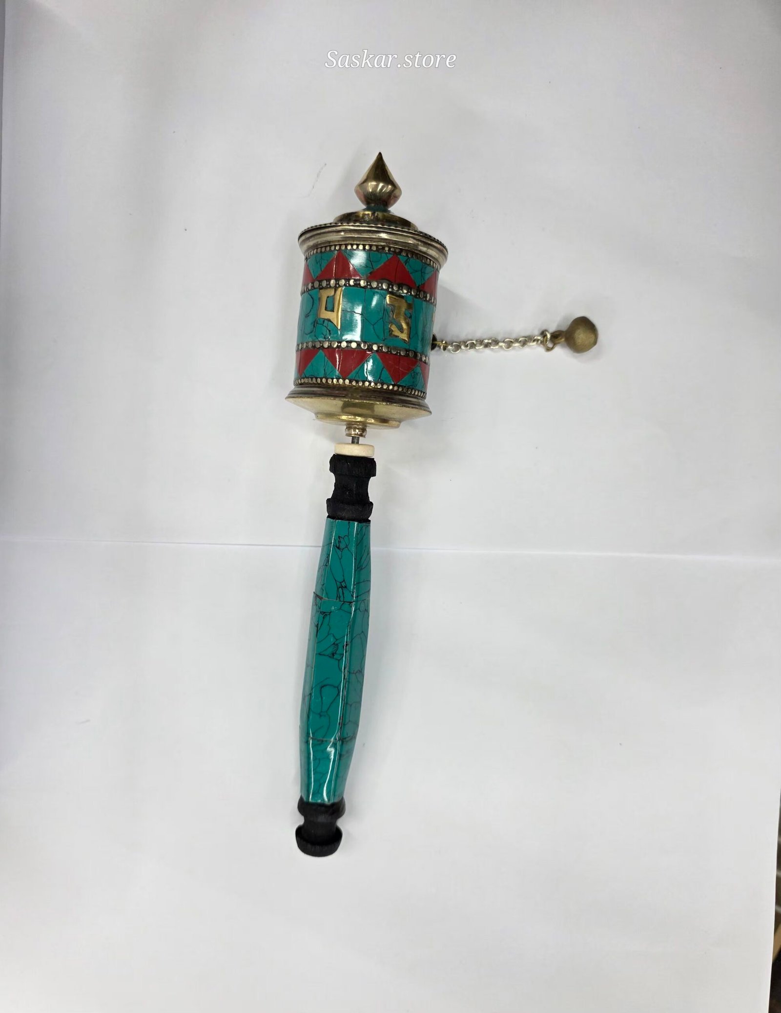 Este hermoso molino está decorado con piedra turquesa y detalles metálicos, incluyendo el mantra sagrado, y cuenta con una cadena con contrapeso que facilita su giro suave y continuo. El mango ergonómico, también decorado, permite un uso cómodo durante prácticas espirituales o como objeto ritual.