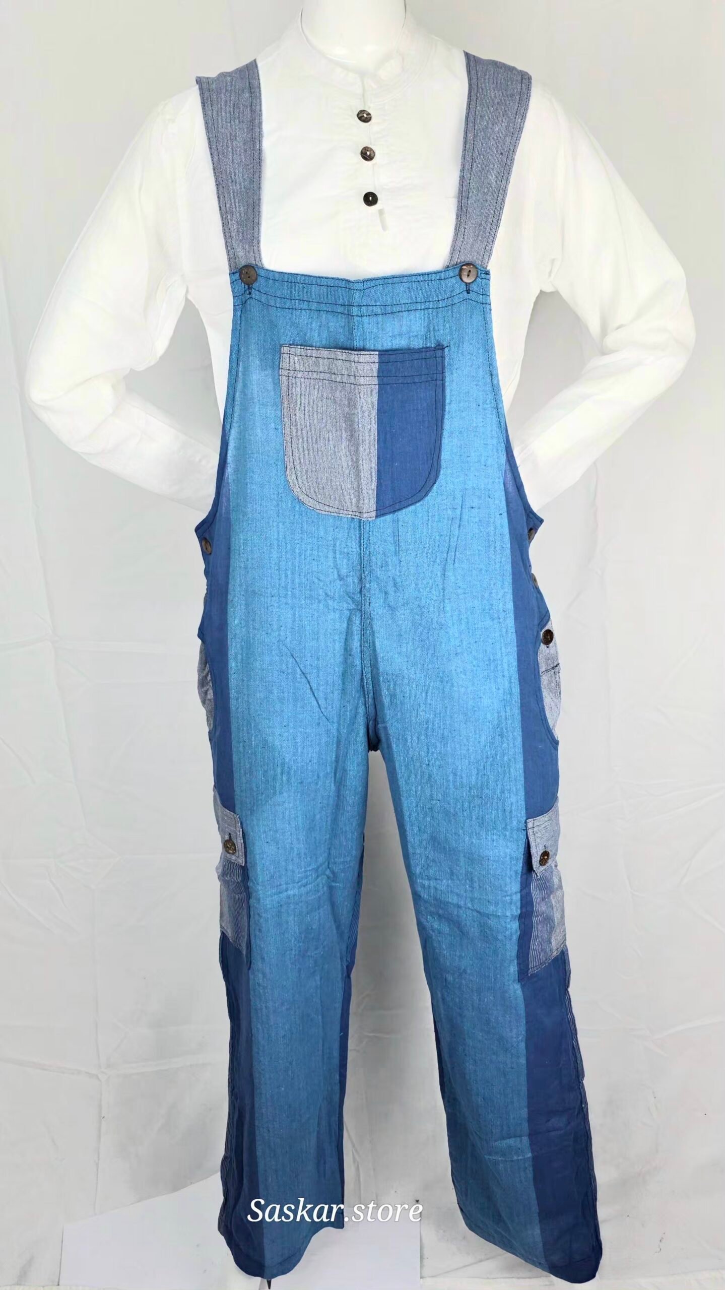Overol multicolor de algodón y lino en tonos azul, gris y azul oscuro. Ideal para un look casual y moderno, con un diseño único que incluye un bolsillo frontal en contraste y botones laterales para un mejor ajuste. Perfecto para primavera y verano, ofreciendo comodidad y estilo.