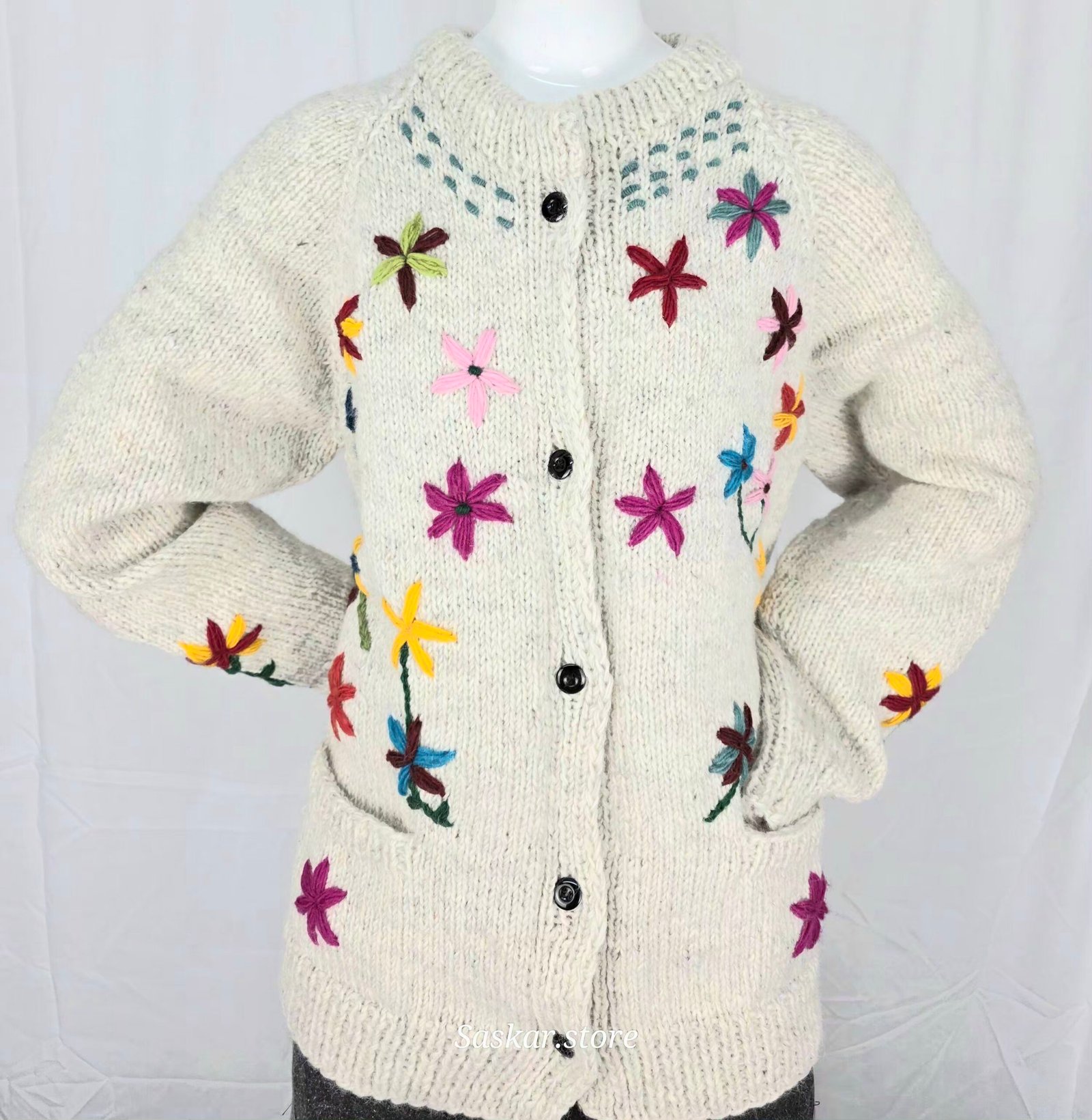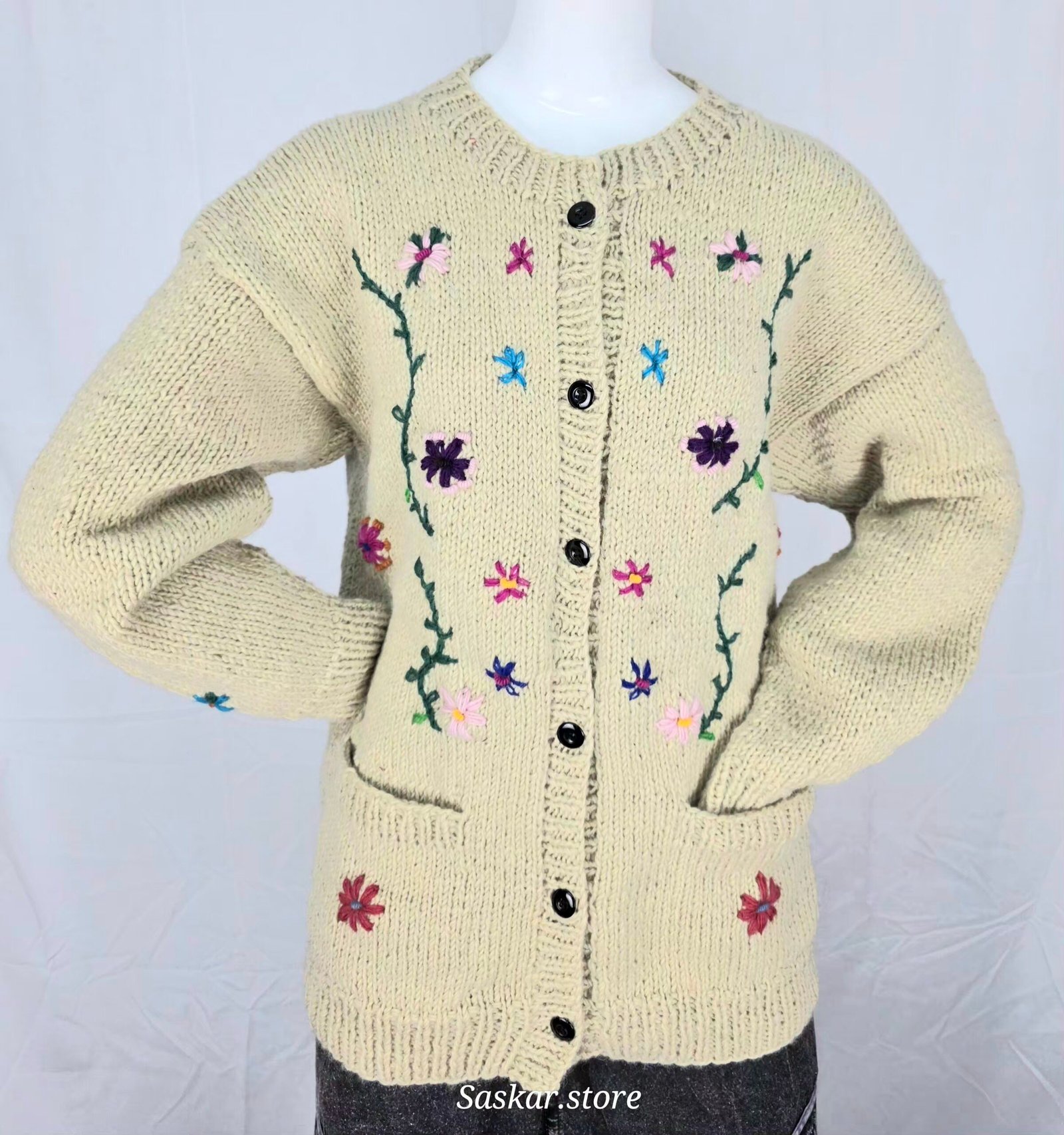 Handmade, floral embroidered wool cardigan, free size