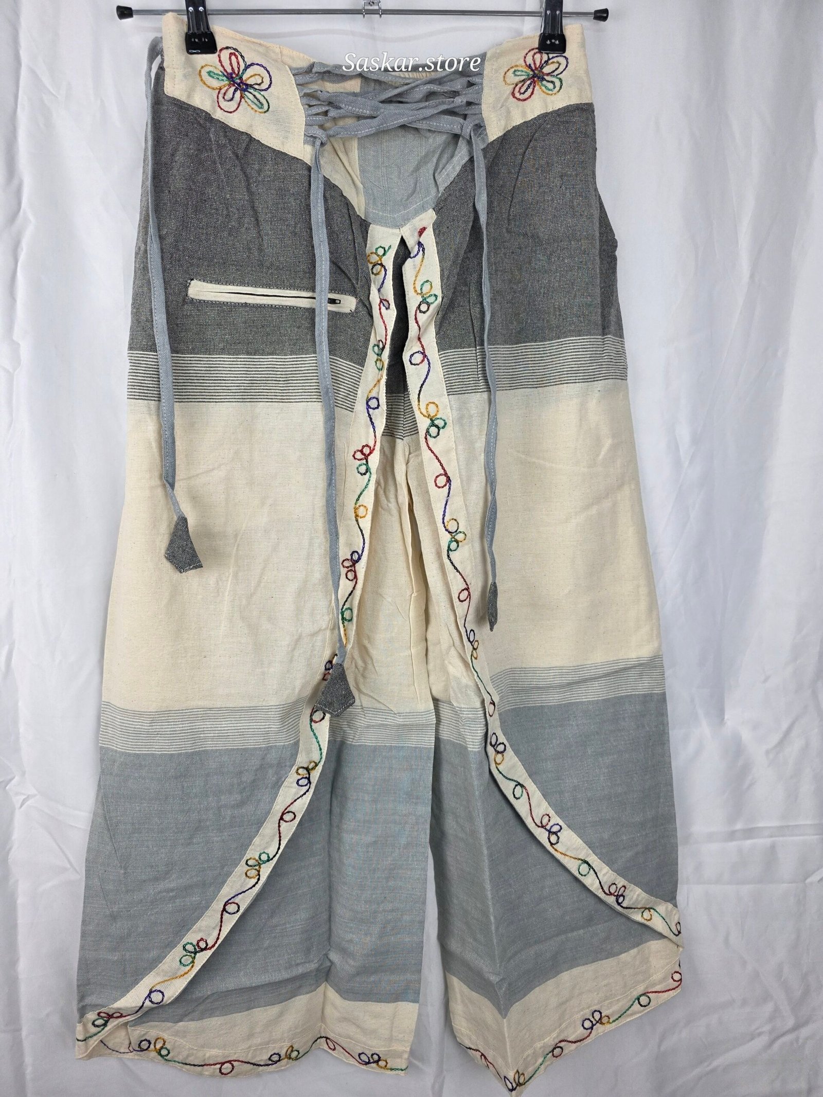 Pantalón artesanal de estilo étnico, confeccionado en algodón ligero y cómodo.Cuenta con cintura ajustable con cordones, lo que permite un ajuste cómodo a diferentes tallas.Un bolsillo con cremallera en el lado derecho.