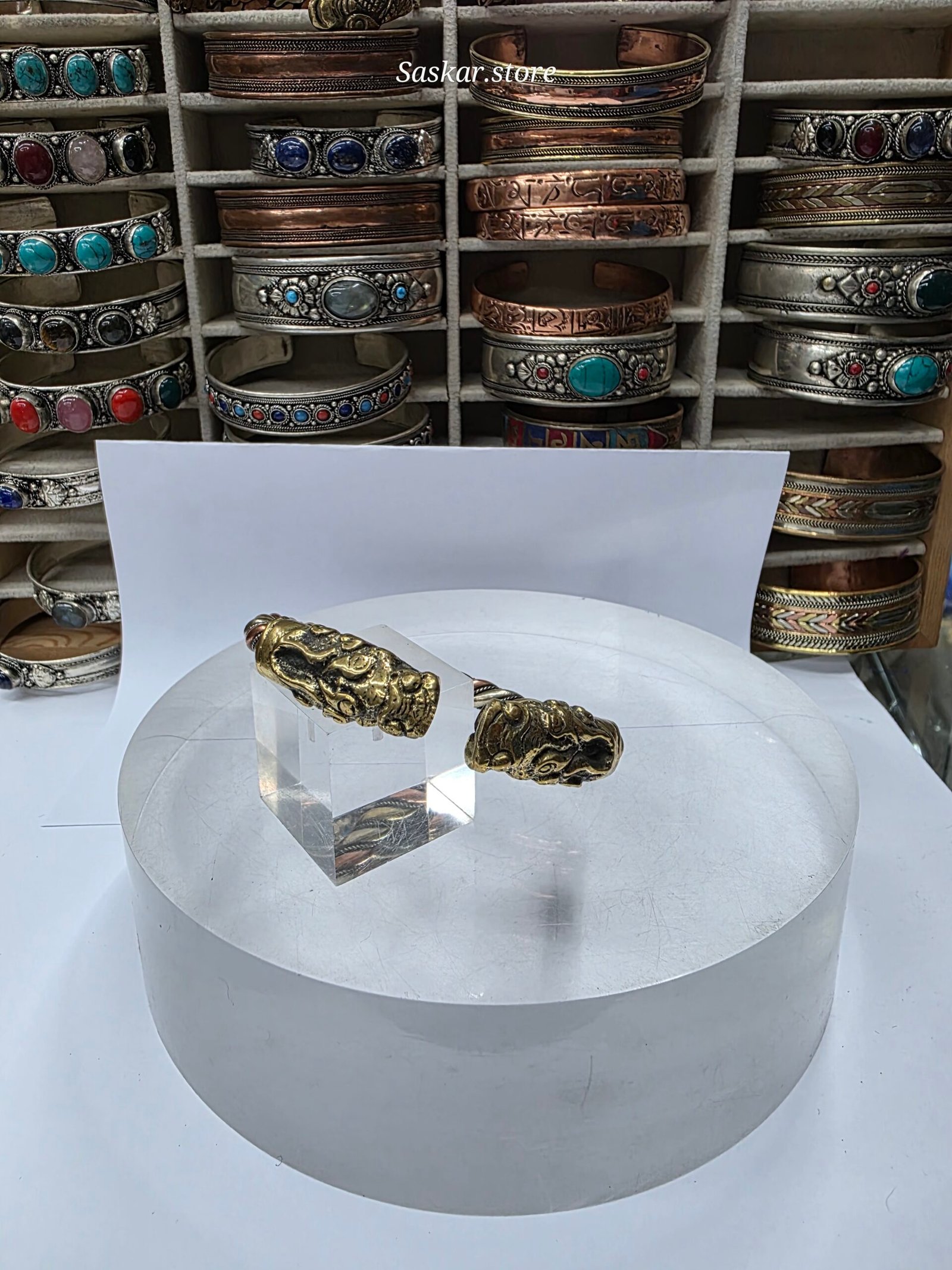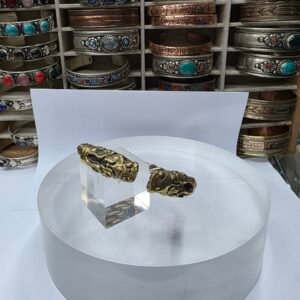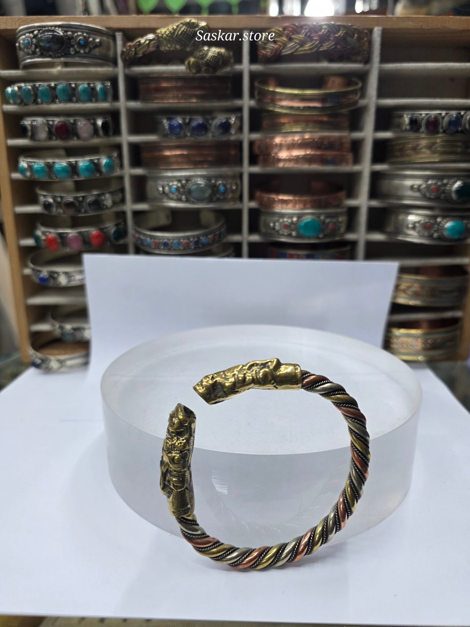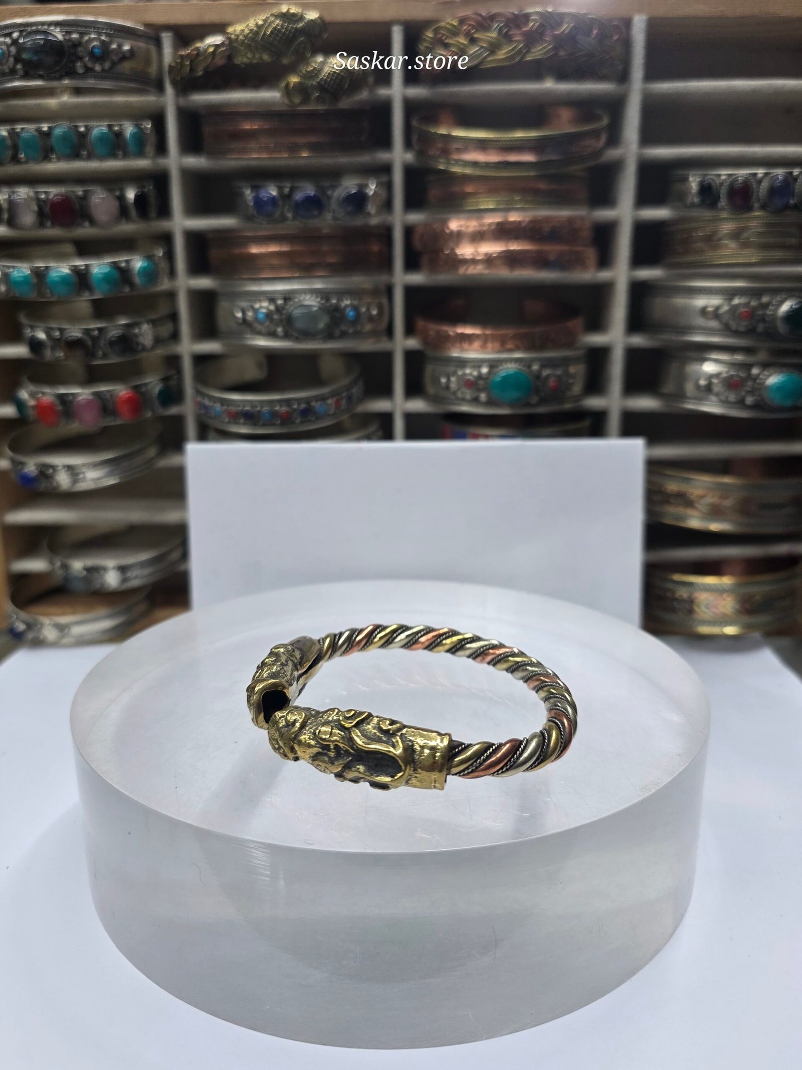 Elegante pulsera rígida de diseño trenzado, elaborada en cobre de acabado dorado envejecido que aporta un estilo sofisticado y distintivo. Sus extremos presentan detalles finamente tallados en forma de cabezas,Pulsera Rígida Dorada – Diseño Trenzado con Cabezas Talladas lo que le da un carácter único y un aire artesanal de inspiración clásica y étnica.