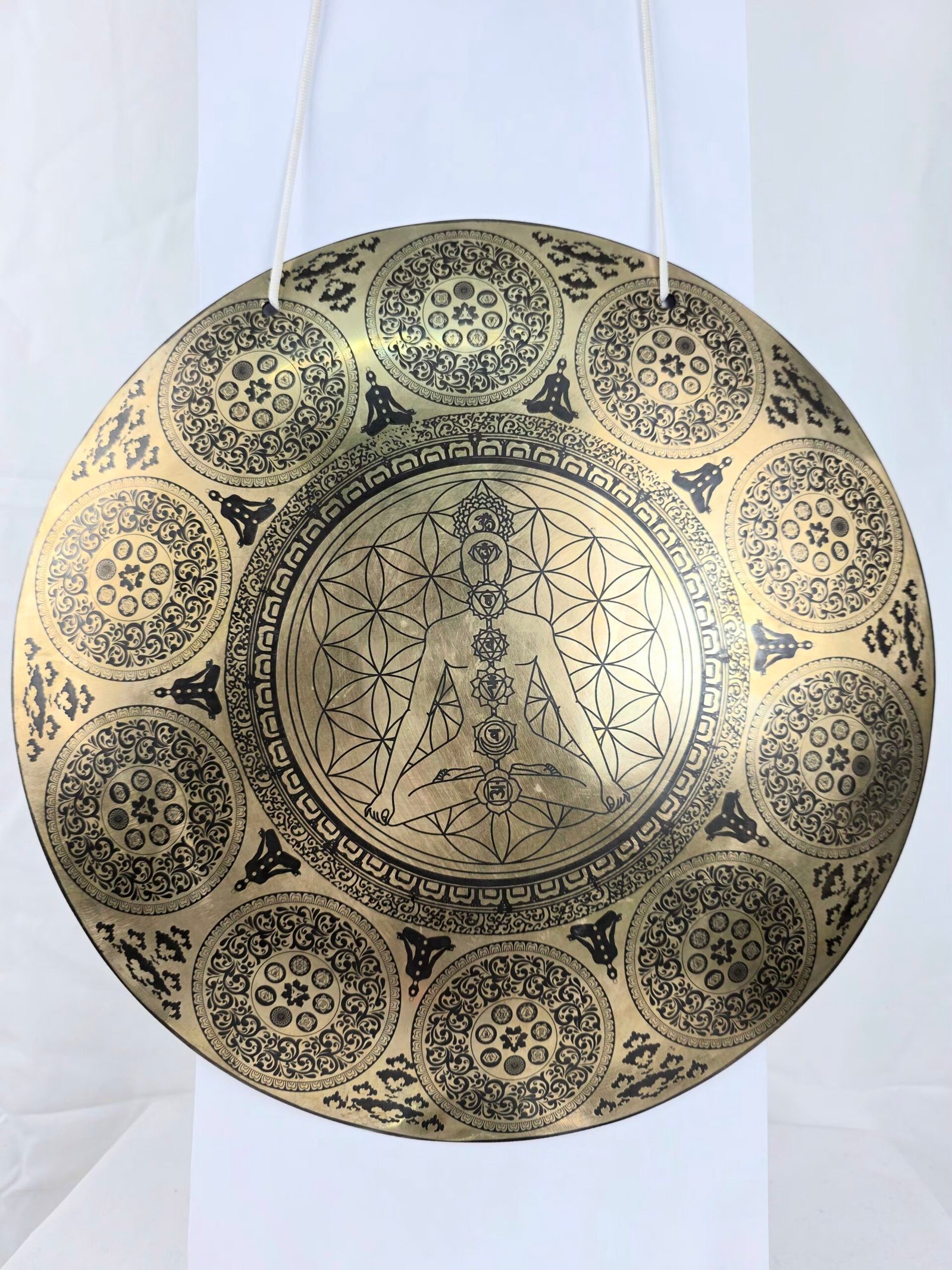 Descripción del Producto : Gong de viento tibetano hecho a mano con un yogui y siete chakras tallados